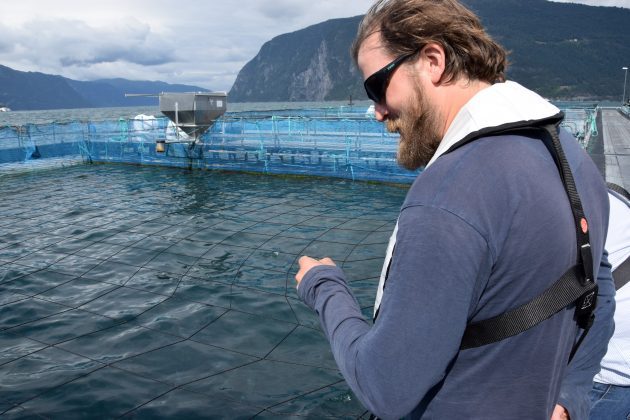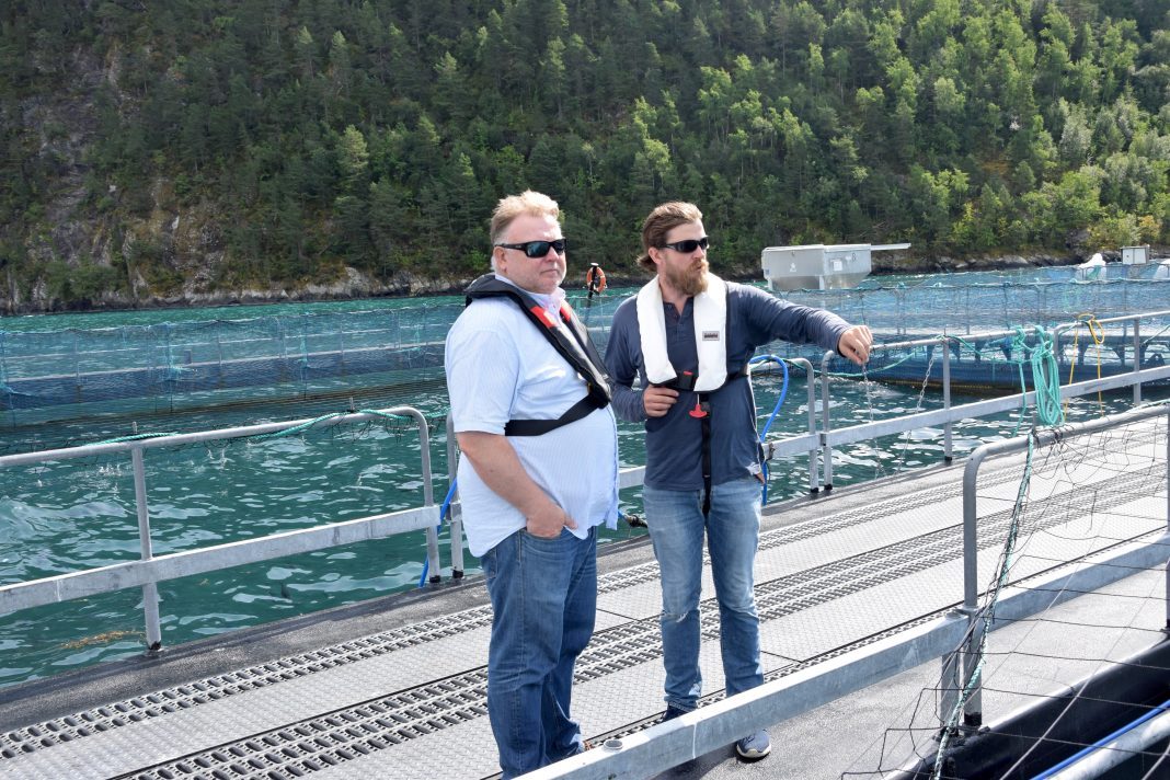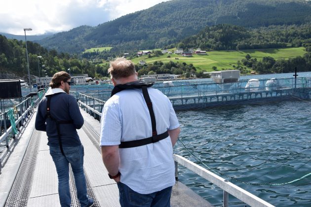 Hofseth Aqua Chief operating officer Svein Flølo, looked over the cage edge and down in pen number six at the Opshaugvik fish farm in Storfjorden in Møre og Romsdal, Western Norway. By his side is location manager Severin Rønes. They both look at a small trout swimming by itself, in a pen where most of the fish are much, much larger.