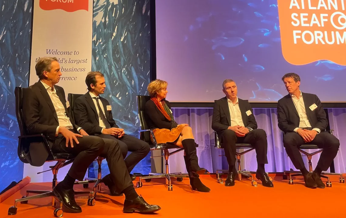 The panel included Anne Hvistendal, Global Head of Seafood at DNB, Steven Rafferty, CEO of Cermaq; Carl-Emil Kjølås Johannessen from Pareto Investment Banking; Jon Hindar, Partner at Summa Equity; and Fulco van Lede, CEO of Nutreco.